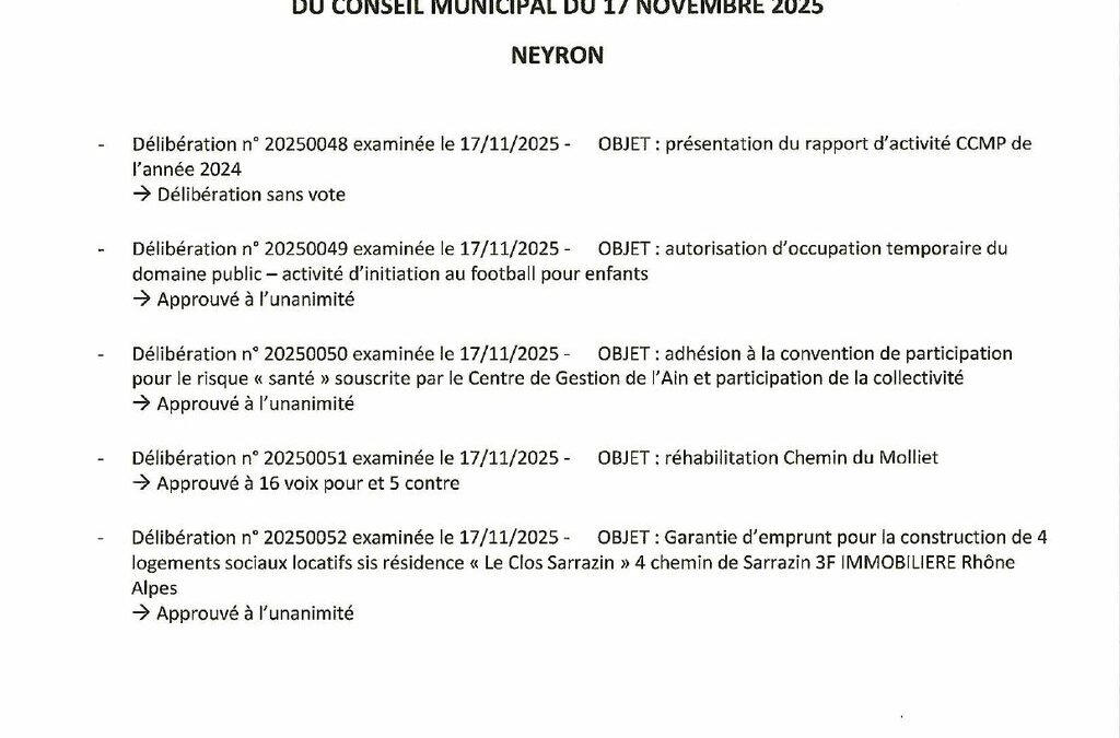 20/11/2025 Liste des délibérations à la suite du conseil municipal du 17 novembre Partager0 Publications connexes19/11/2025La Semaine Européenne de la Réduction des Déchets (SERD)Plus d'infos16/11/2025Vente traditionnelle de saumon – Sou des Écoles de NeyronPlus d'infos16/11/2025🎄 Vente de Sapins de Noël – Sou des Écoles de Neyron 🎄Plus d'infos