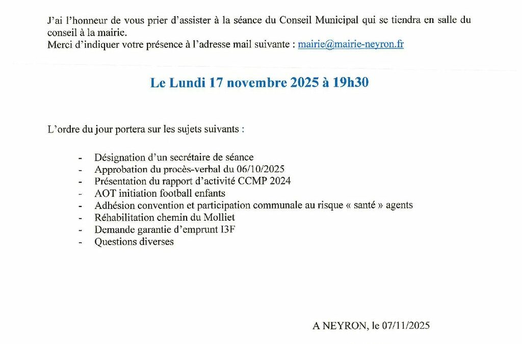 08/11/2025 Prochain conseil municipal le lundi 17 novembre à 19h30 en mairie Partager0 Publications connexes06/11/2025Jour Férié – Mardi 11 novembre 2025Plus d'infos02/11/2025Cérémonie de commémoration au monument aux morts mardi 11 novembrePlus d'infos31/10/2025Jeux et goûter intergénérationnelsPlus d'infos